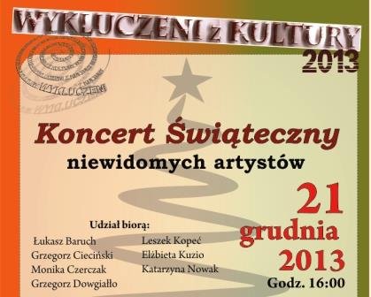 Zapraszamy 21 grudnia na godzinę 16 do Centrum Kultury Wrocław Zachód na Świąteczny Koncert w wykonaniu artystów niewidomych. Udział wezmą: Łukasz Baruch, Grzegorz Cieciński, Monika Czerczak, Grzegorz Dowgiałło, Leszek Kopeć, Elżbieta Kuzio, Katarzyna Nowak. Towarzyszyć im będzie zespół muzyczny