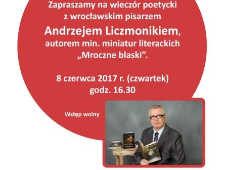 Informujemy, że wkrótce odbędzie się wieczór poetycki z wrocławskim słabowidzącym pisarzem Andrzejem Liczmonikiem. Zapraszamy do Miejskiej Biblioteki Publicznej (Filia nr 23) przy ul. Bulwar Ikara 29-31 w czwartek, 8 czerwca 2017 roku.