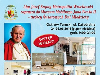 Serdecznie zapraszamy na zwiedzanie Mobilnego Muzeum poświęconego postaci św. Jana Pawła II, który jest twórcą Światowych Dni Młodzieży. W piątek 24 czerwca spotykamy się o godz. 16.30 przy ul. Katedralnej 4 (pod 4), aby wspólnie pójść na zwiedzanie. Wstęp bezpłatny!