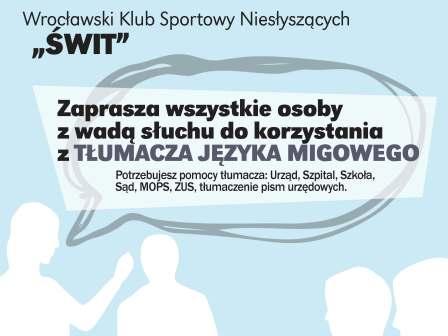 Wrocławski Klub Sportowy Niesłyszących "Świt" otrzymał dofinansowanie z Urzędu Marszałkowskiego na projekt "Asystent osób niesłyszących". Asystent czyli tłumacz języka migowego będzie dostępny dla osób niesłyszących od kwietnia we Wrocławskim Klubie Sportowym Niesłyszących "Świt"